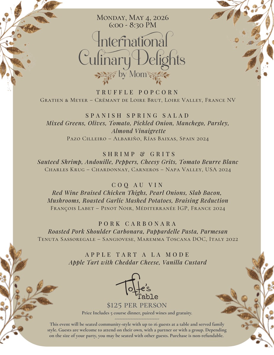 Join us for a relaxed, five-course dinner inspired by comfort foods from around the world—because nothing hits quite like Mom’s cooking. Each course features flavors from Spain, the U.S., France, and Italy, paired with wines from the same regions to bring it all together. With Mother’s Day right around the corner, it’s a great chance to celebrate a little early.